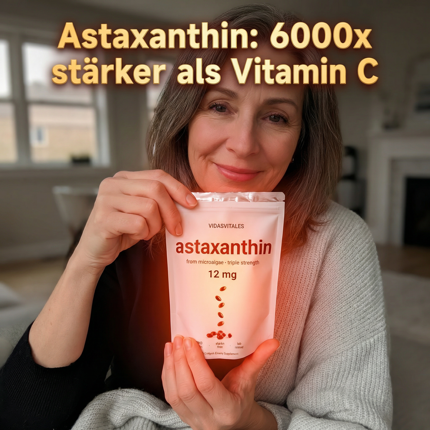 • "I used to never leave the house without foundation. My skin looked dull, tired, and uneven. After the first month with astaxanthin, my skin has a natural glow that I didn't even have when I was 20. Now I go out without makeup, just moisturizer and sunscreen. I feel free and confident for the first time in years."